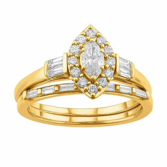 Adorned with baguette- and round-cut diamonds, this Simply Vera Vera Wang marquise engagement ring and wedding band set will be cherished for a lifetime.
