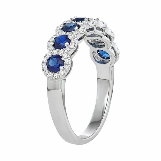 Designed with eye-catching sapphires surrounded by halos of diamonds, this 14k white gold ring is a captivating accessory.