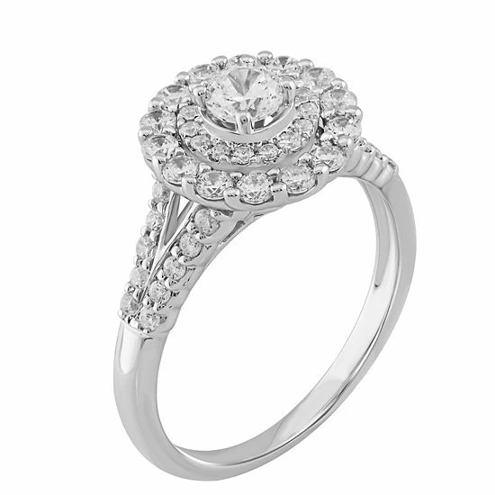 Featuring a stunning, round-cut diamond center stone surrounded by halos of shimmering diamond accents, this Simply Vera Vera Wang engagement ring is sure to take her breath away.