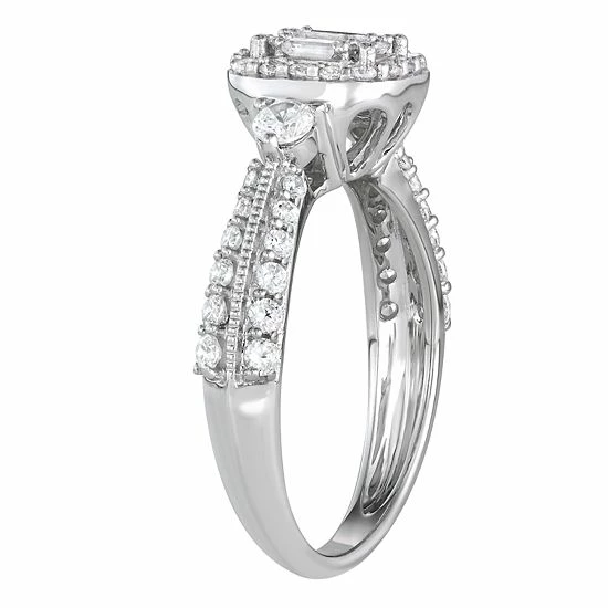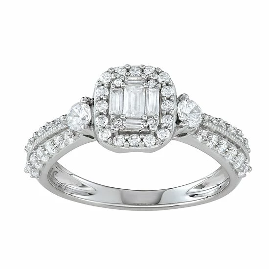 Featuring dazzling diamond baguettes set within a cushion-shaped halo of diamonds, this Simply Vera Vera Wang engagement ring is an elegant symbol of your commitment.