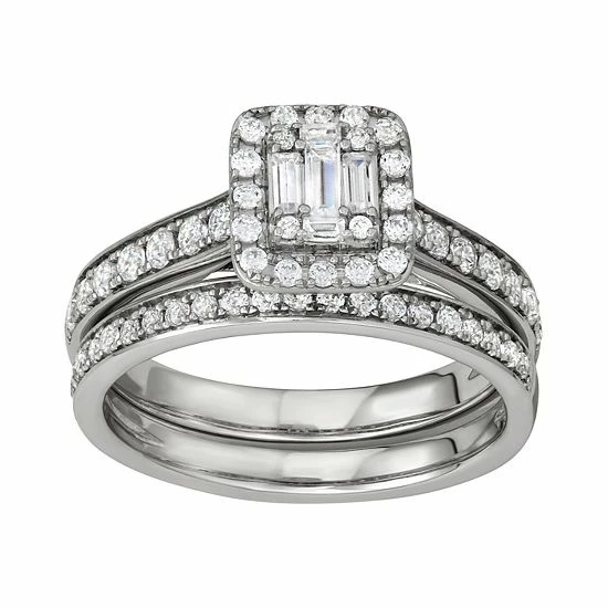 Convey your love in a magnificent way when you propose with this beautiful Simply Vera Vera Wang engagement ring set. Featuring diamond baguettes surrounded by sparkling diamond accents, this halo engagement ring set is sure to be adored.