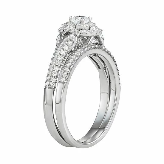 Adorned with a cluster of round-cut diamonds accompanied by diamond accents along the band, this beautiful Simply Vera Vera Wang bridal set is a magnificent symbol of your commitment.