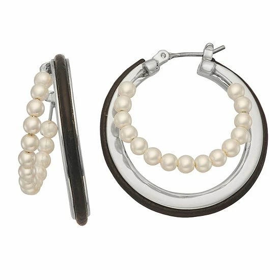 Edge meets glam in these silver tone leather and simulated pearl layered hoop earrings from Simply Vera Vera Wang.