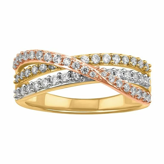 Shimmering with round-cut diamonds, This Simply Vera Vera Wang tri-tone crossover ring is a distinctively stylish accessory.