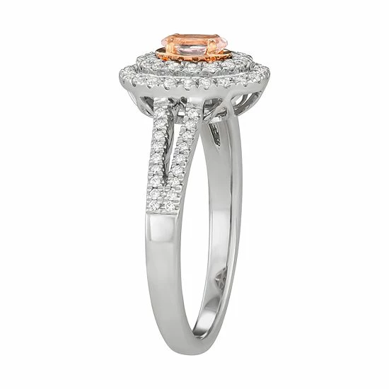 Featuring a dazzling, oval-cut morganite center stone, this fashionable Simply Vera Vera Wang halo ring lends lends a touch of panache to your look.