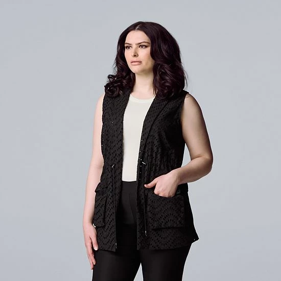 With a feminine eyelet front and crepe backing, this women’s pocketed vest from Simply Vera Vera Wang is a cute addition to any wardrobe.